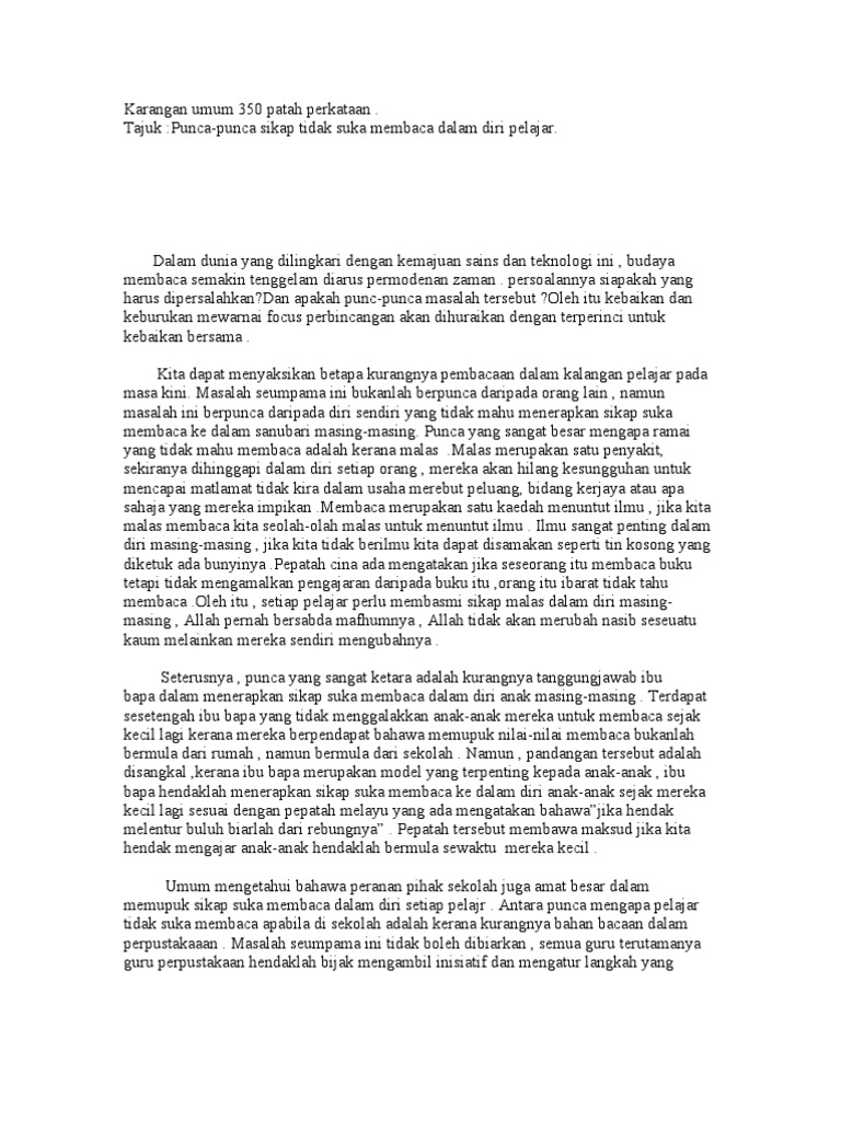 Panjang huraian hendaklah melebihi 300 patah perkataan. Tajuk Punca-punca sikap tidak suka membaca dalam diri pelajar.